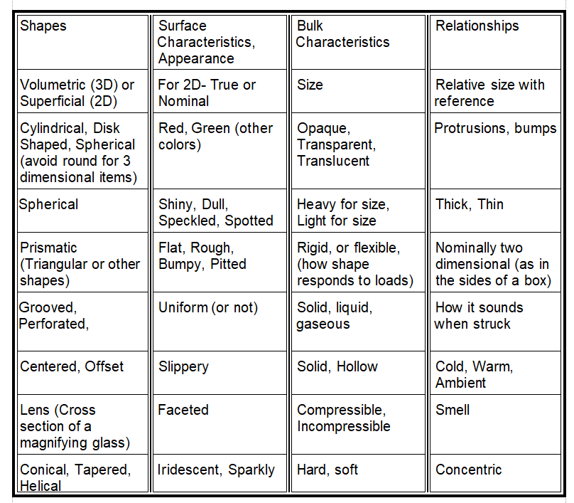 Here is my list of the types of features that I taught may be thought of as basic facts about a concrete object. Features that anyone with more or less normal vision and kinesthetic sensory function can test for themselves.